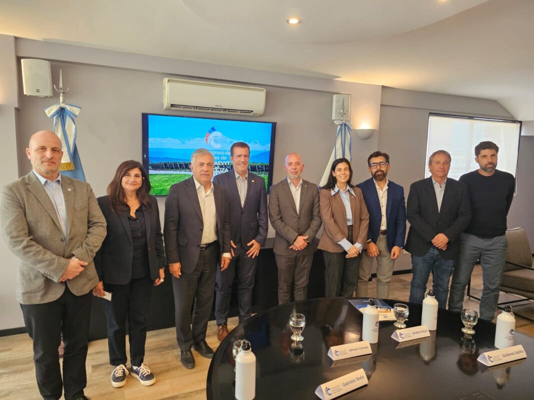 Entre los presentes estuvieron el gobernador Alfredo Cornejo; el presidente de FAEVYT, Andrés Deyá; la titular del Ente Mendoza Turismo, Gabriela Testa; Laura Teruel y Fernando Desbots, presidenta y vice de la Cámara Argentina de Turismo y Willy Querciali, titular del Consejo Federal de Turismo, junto a empresarios y especialistas del rubro.